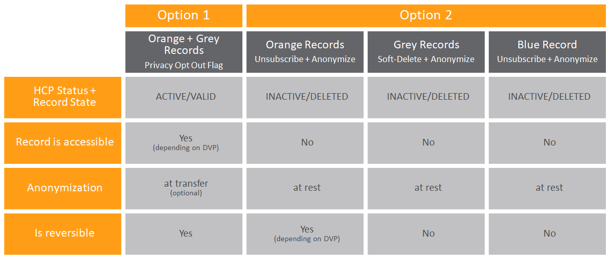 One further note on HCOs before we proceed with detailing the options: The data privacy rights defined under the GDPR apply only to natural persons, not to organizations. Therefore everything in the following refers to HCP records and is not applicable to HCOs.