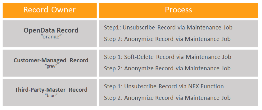 The process for third-party-managed records requires again an unsubscribe, however unlike for OpenData records there is no maintenance job for unsubscribing third-party-managed records. Instead there is a NEX function to unsubscribe “blue” records that you need to call within your third-party master subscription.