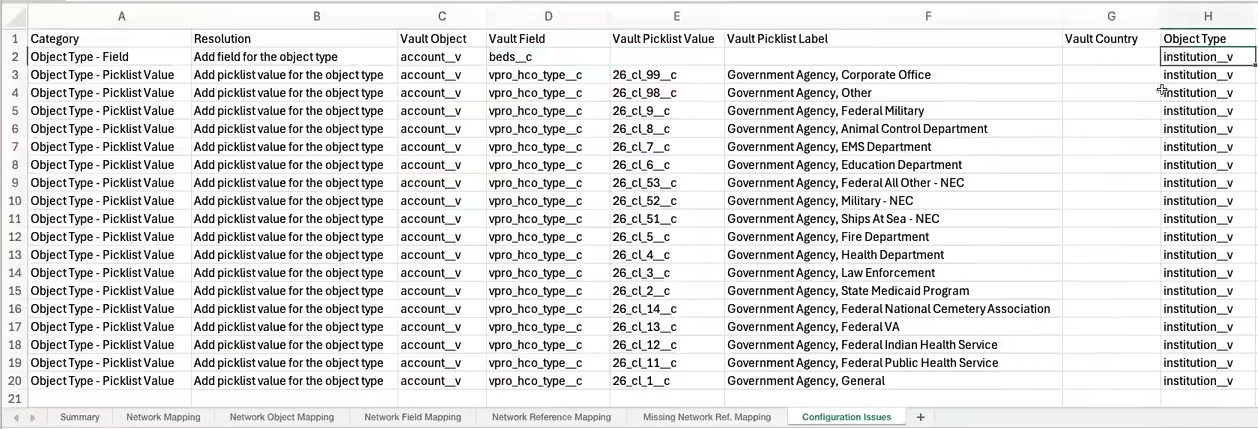 | Confguration Issues | Counts (Object type issues for missing picklist values and fields from the Network Reference Mappings) |