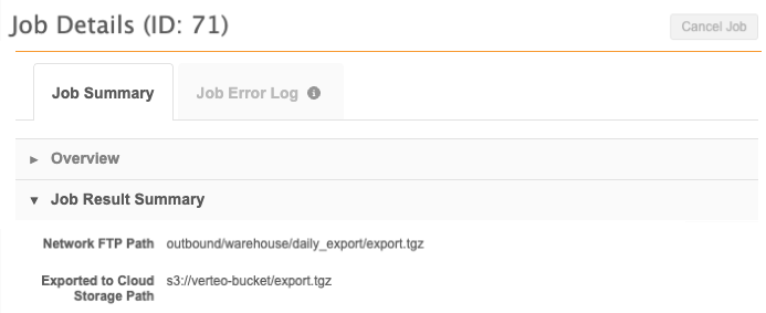 After you run the source subscription, the Job Details page includes the export path on the Job Result Summary tab.