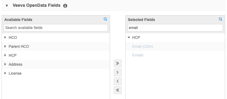In the Veeva OpenData Fields section, ensure that the Emails field has moved to the Selected Fields pane.