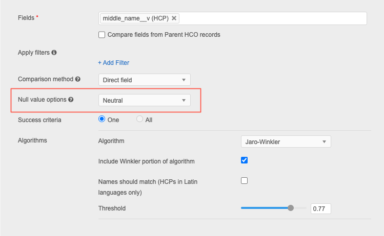 A field you choose to match on may be an important field, like first_name__v. If the data in the incoming data for that field is empty, you do not want a comparison on the first_name__v field to be considered a match. Change the default Null value options setting to Do not match so any comparison that includes an empty field will not be considered a match.