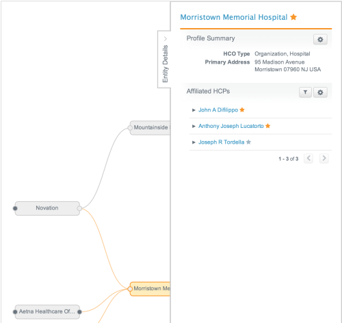 You can easily view details for an organization from the Network Explorer, including a list of health care professionals affiliated with the organization. You can also configure the details to see additional information, such as counts of the organization’s staff, locations, beds, and indicators of the organization’s services and protocols.