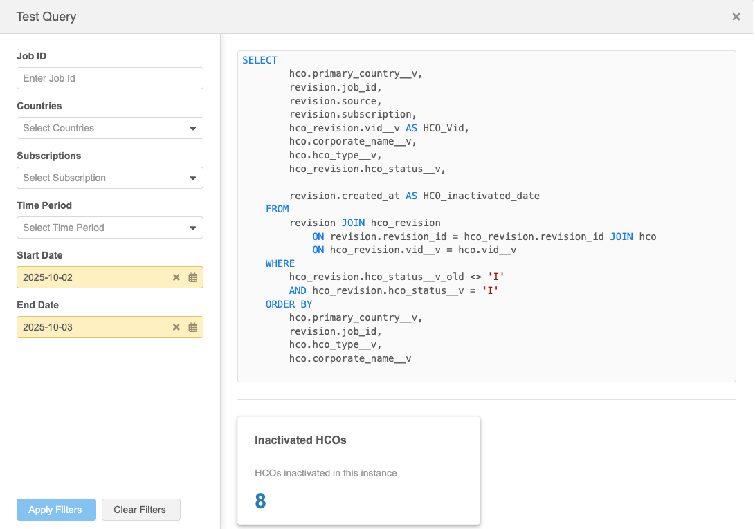Inactivated HCOs | HCOs that have been inactivated. Results include HCOs with any record state that have their hco_status__v field changed to "I". |