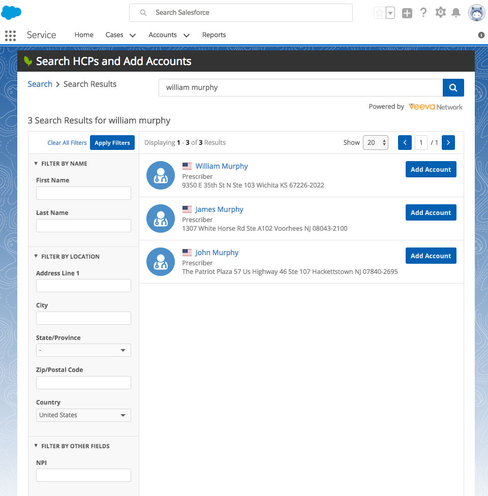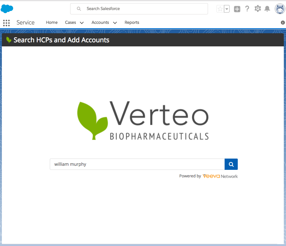 Using the search widget, business users can search for and view real-time master data from your external application without logging directly into the Network instance. For example, call center representatives can search and download HCPs within Network and Veeva OpenData without leaving the application they are currently in, or sales reps can search for and attach an HCP's record to an expense or event.