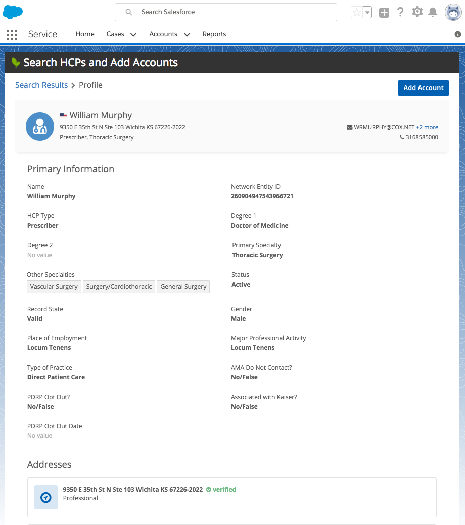The widget profile page displays the record, which includes the entity-level and sub-object details. Clicking Add Account can download the record to your Network instance from Veeva OpenData. This also provides your application developer with the entity data, in JSON format, for the downloaded record.