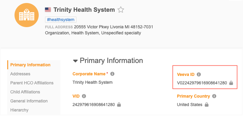 The Veeva ID displays in the Primary Information section on standard profile layouts.