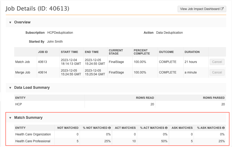 The new statistics are available in the Match Summary section in the Job Details for the following features: