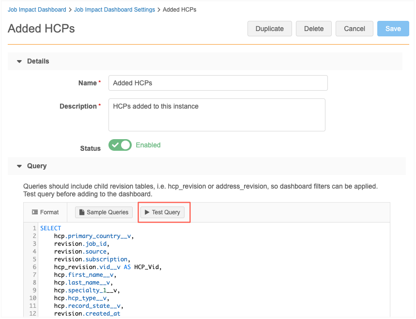 In the Query section, click Test Query.