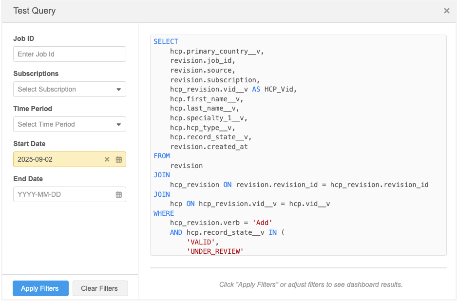 In the Test Query dialog, provide sample filters.