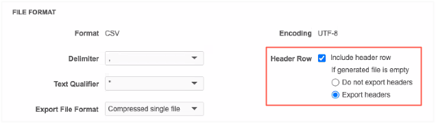 If the Include header row setting is enabled in an existing subscription, the Do not export headers option is set by default.