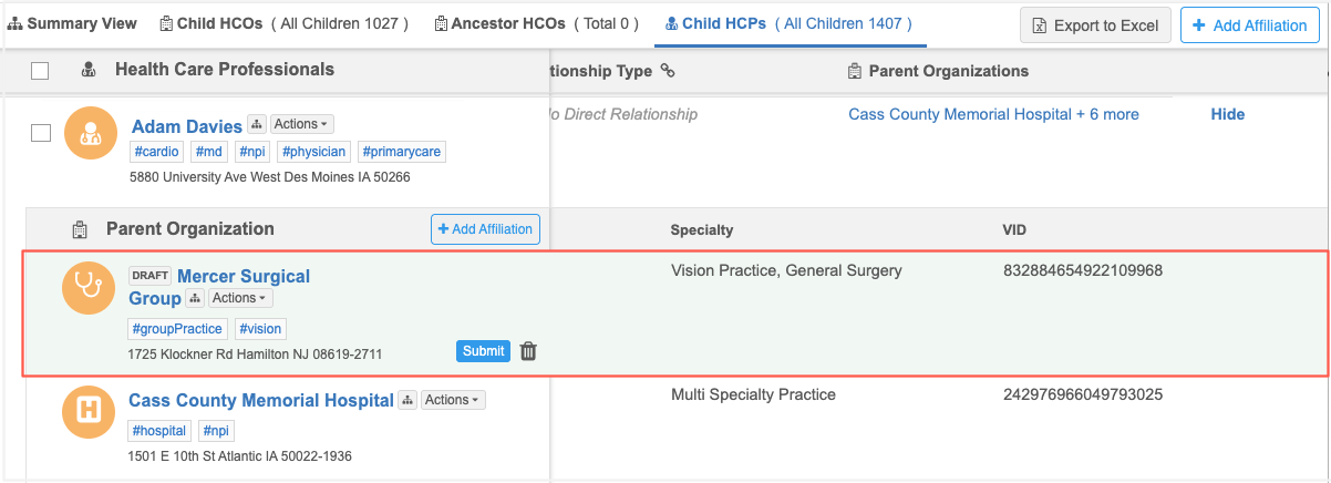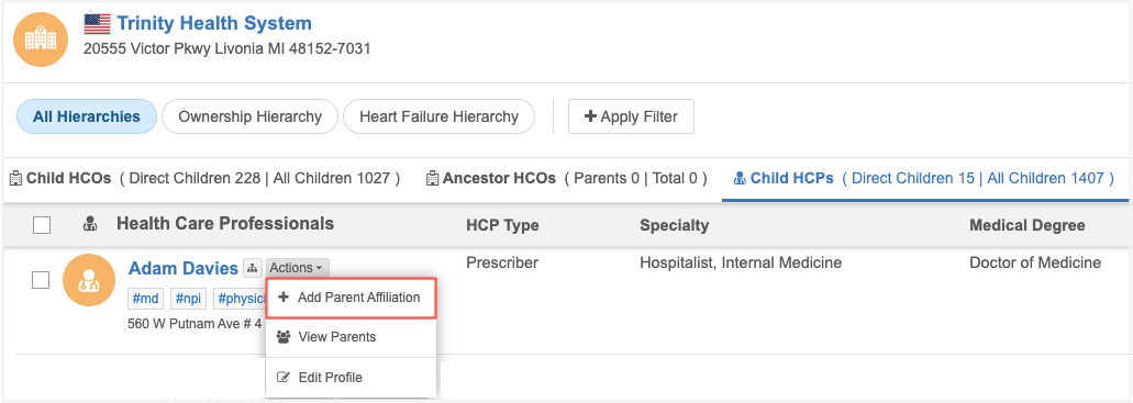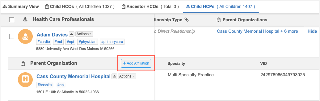 Parent Affiliation - On the Child HCPs tab, beside an HCP, click Actions > Add Parent Affiliation.