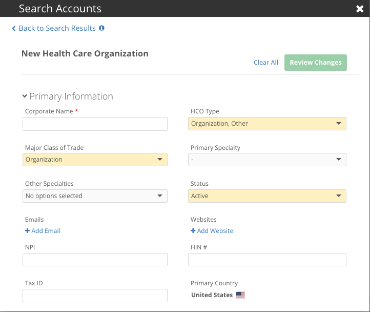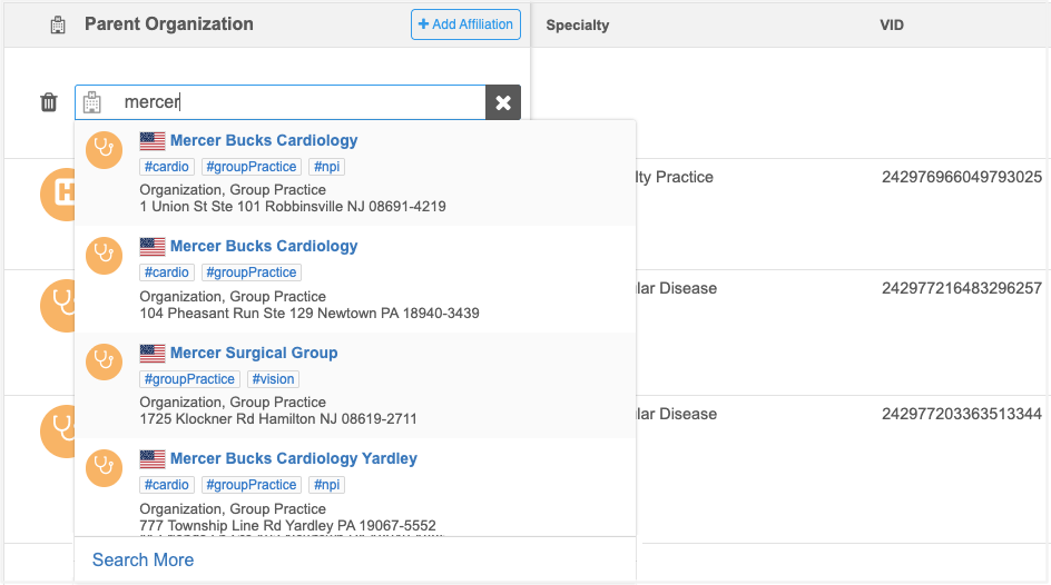 Administrators can include a Search widget in Hierarchy Explorer, so users can search for affiliations in Veeva OpenData and submit add requests for new HCOs and HCPs. Previously, affiliations could be added only from your Network instance.