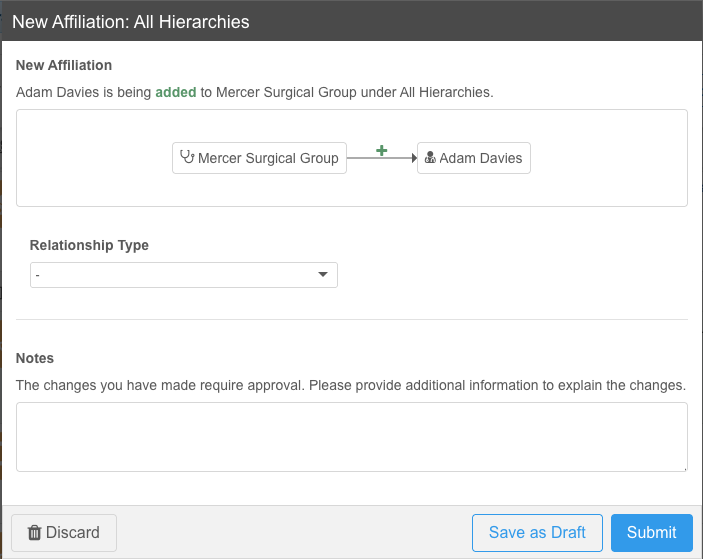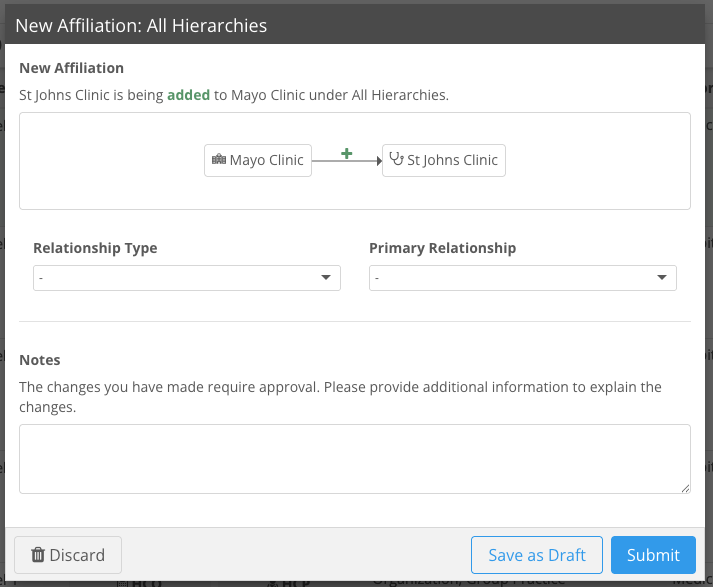 In the New Affiliation dialog, confirm the details and add notes to help Data Stewards to quickly action the DCR.