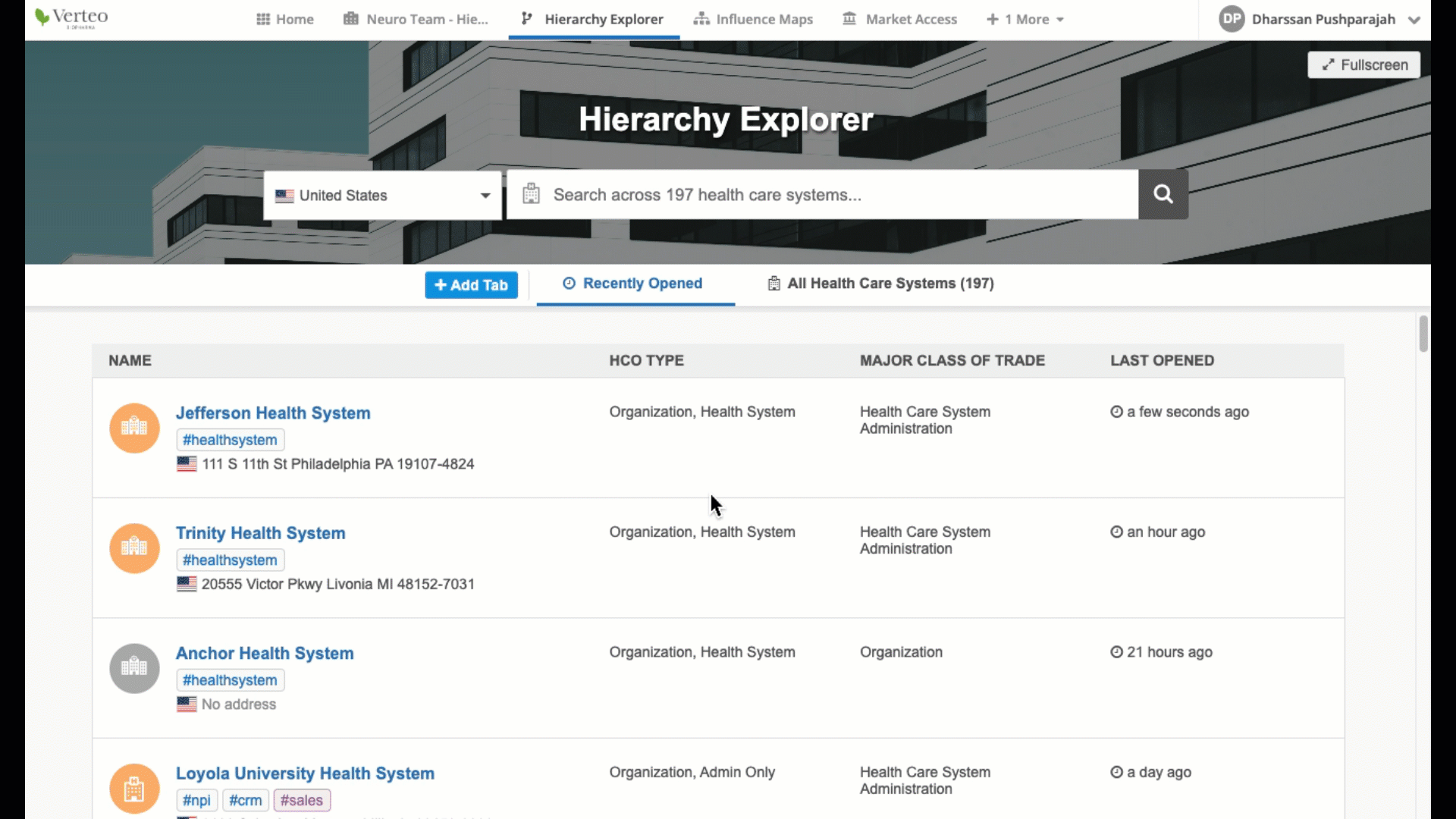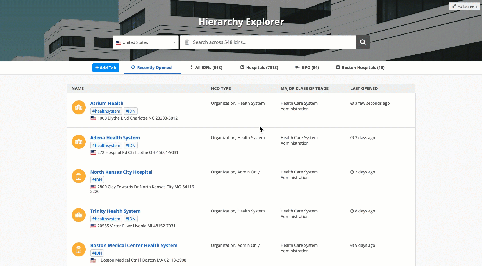 Hierarchy Explorer is a Network widget that you can use to see all levels of an HCO's structure, making it easy to visualize their hierarchy and find new targets.