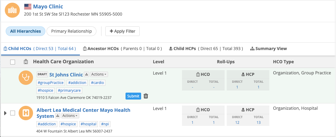 Child HCO - On the Child HCOs tab, beside an HCO, click Actions > Add Child HCO.