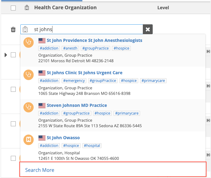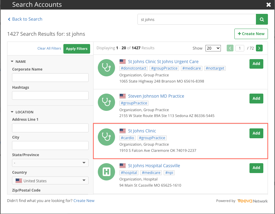 The Search widget opens and displays the search results for your keywords. Only results for the object type (HCO or HCP) you are adding display.