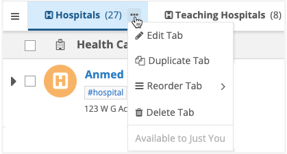 Widget users can create tabs to organize HCOs and HCPs on key networks. This enables users to see the segments of data without filtering the hierarchy each time they visit the widget. For example, you can create tabs to organize hospitals, 340B Accounts, Records with Sales Tied to it, and oncologists.