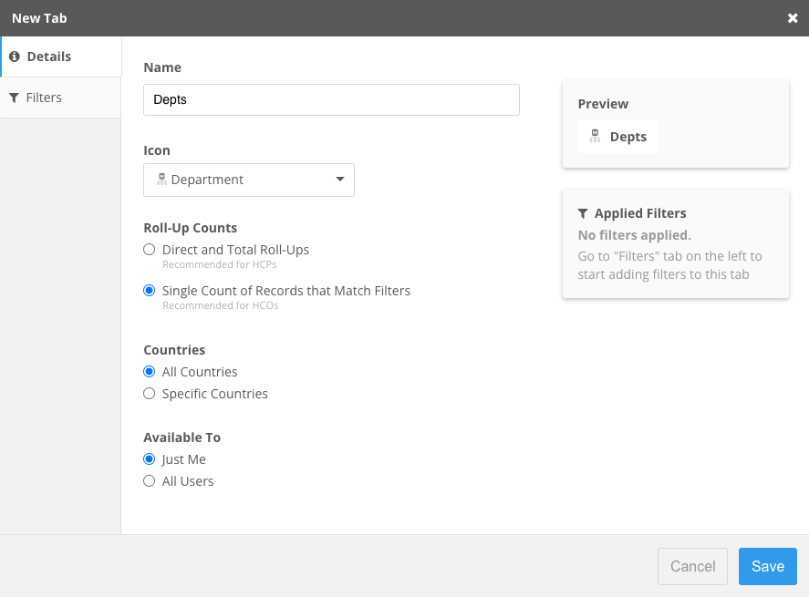 Countries - Define the countries for the tab. Users can access the tab if they have a data visibility profile for that country.