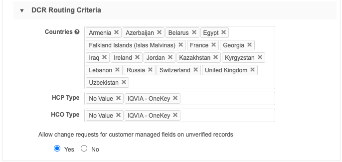 In the DCR Routing Criteria, define the configuration for routing records to IQVIA for DCR processing.