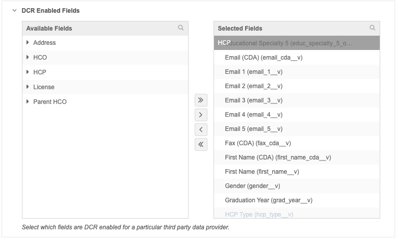 DCR enabled fields - Move all fields that will be managed by IQVIA into the Selected Fields pane. CDA fields are now supported for third-party system configurations.