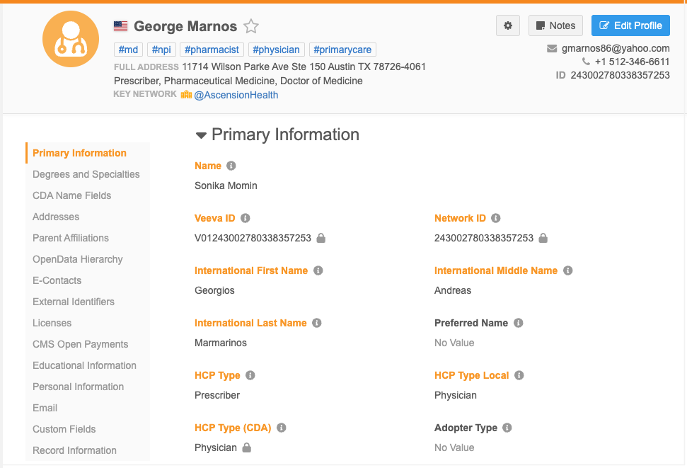 | primary_affl_name__v | Primary Affiliation Name | Text | The Name of the primary, direct parent affiliation for the child HCP/HCO. | HCP | Veeva |