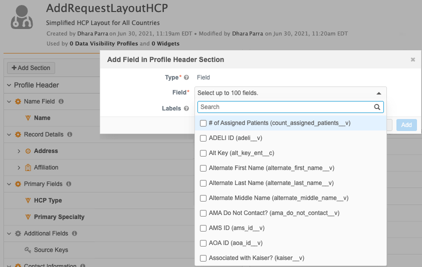 Administrators and Data Managers can now bulk-add up to 100 fields to a custom profile layout in a single action. Previously, fields were added individually. To ensure accuracy during selection, the API name displays beside each field label, making it easy to distinguish between similar fields.
