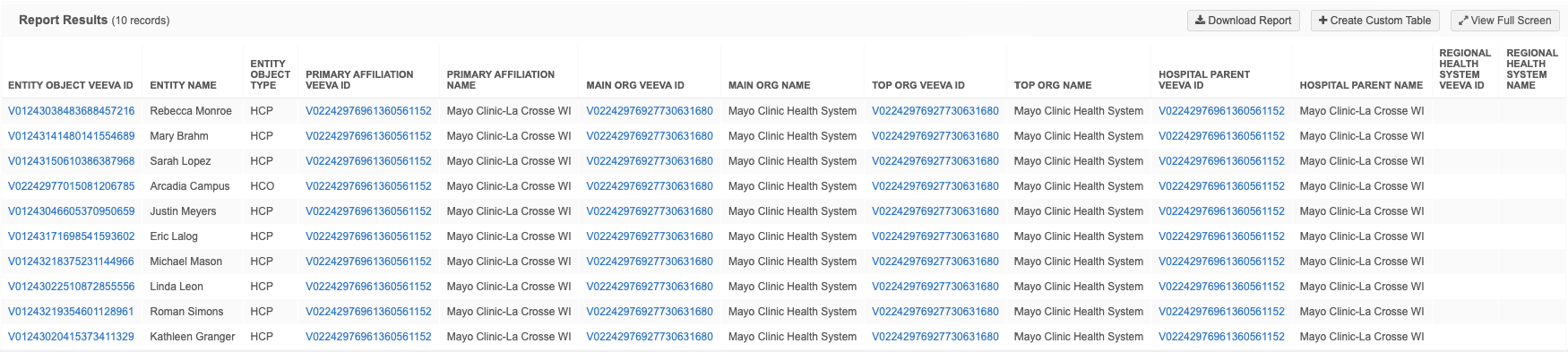 | Entity Object Veeva ID | entity_veevaid__v | Veeva ID of the HCP or HCO that is the source of this rollup. |
