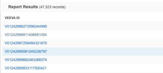 Report results that include the Veeva ID (veevaid__v) field display a link for each ID. Click the link to open the record profile in a new browser tab.