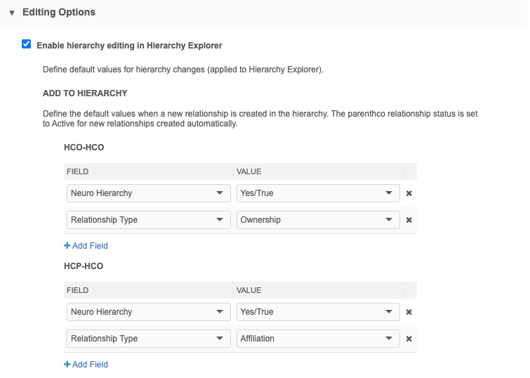 For example, set the Neuro Hierarchy field to Yes/True and the Relationship Type field value to Ownership when users add HCO-HCO relationships.