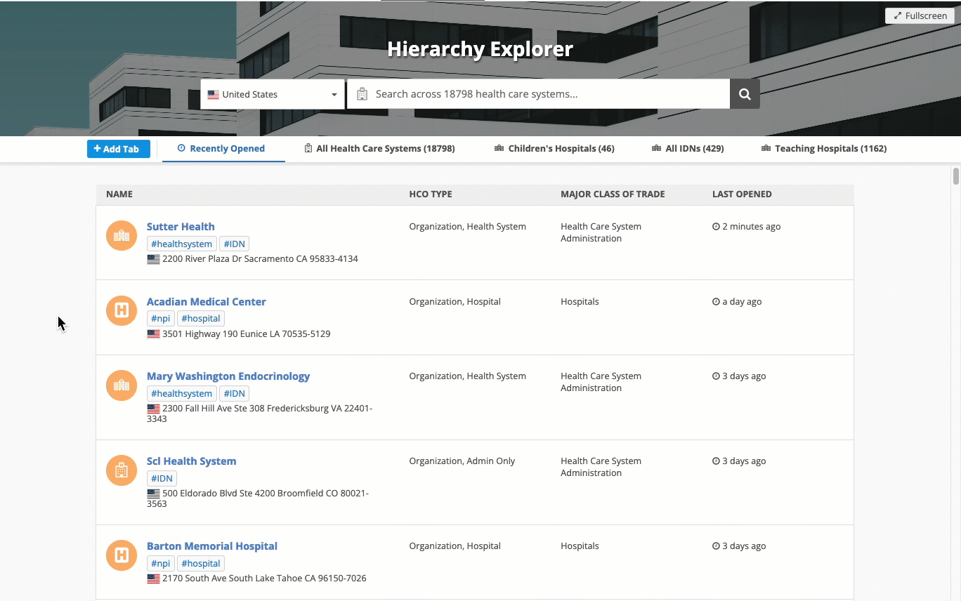 Explore all affiliated HCOs for an HCP in the health system- Use this information to see other HCPs that work for the affiliated organization and the health system the HCO is affiliated with.