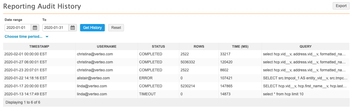 Possible valuesCOMPLETED: the query completed successfully.TIMEOUT: the query took too long and timed out.ERROR: the query contained an error. - Rows - the number of rows returned by the query.
