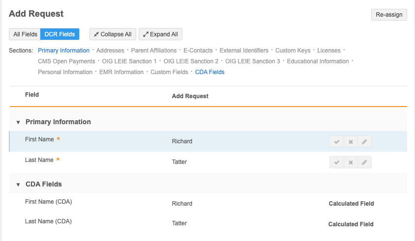 On this add request, a user submitted the required values on the First Name CDA and Last Name CDA fields. The CDA field values are mapped to the legacy fields, so Data Stewards can process the changes on the legacy fields.