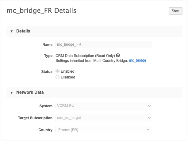 View details - Click the name of the child bridge to open its Details page and review the settings inherited from the multi-country bridge. The data is read-only.