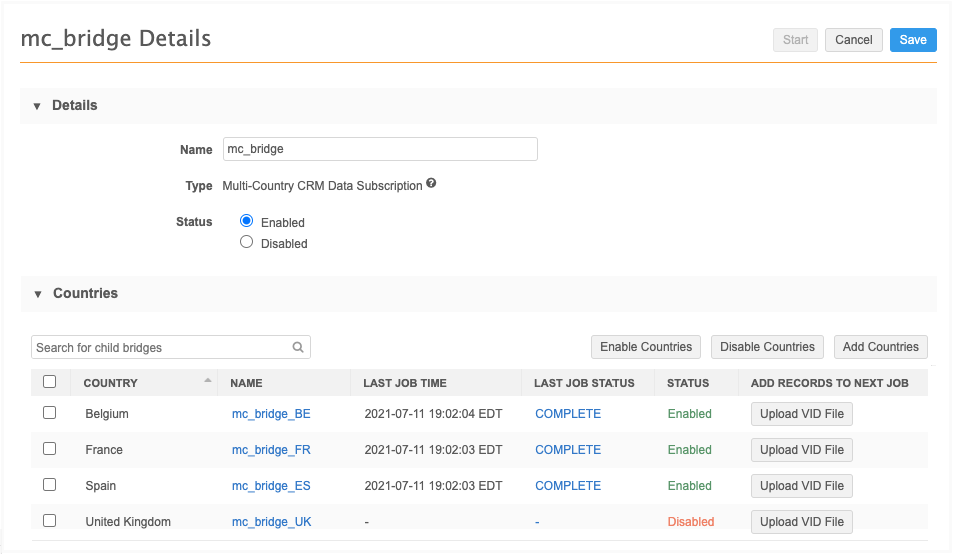 After the multi-country bridge configuration is saved, the bridge's Details page lists the child bridges in the Countries section. You can view the time that the last job ran and the job status for each country.
