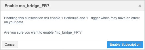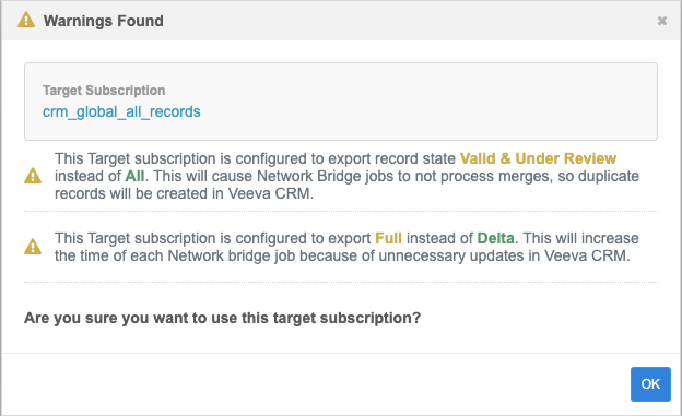 If the Bridge is linked to an incorrectly configured target subscription, a warning displays. The warnings will prevent data issues in Veeva CRM.