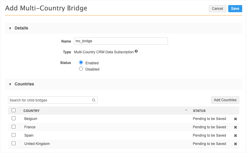 The countries are added to the configuration, but they are pending until the subscription is saved. Countries that are pending can be removed from the bridge configuration. Click the x icon to delete the country.