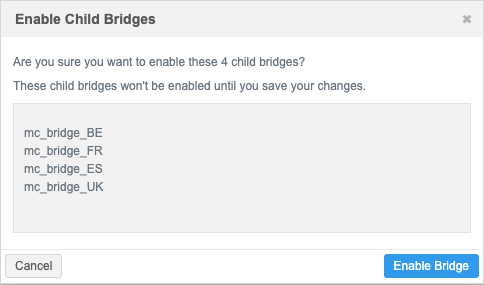 In the dialog, click Enable Bridge. When you save the multi-country bridge configuration, the selected child bridges will be enabled.