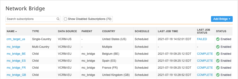 A multi-country bridge is a single bridge that is applied to several countries. Each country is considered to be a read-only child bridge. When the bridge runs, the target subscription runs individual jobs for each country in parallel so if one job fails, the other jobs will continue.
