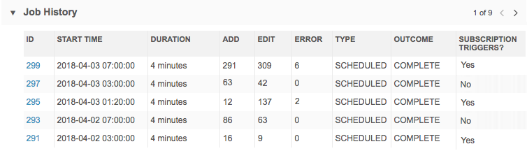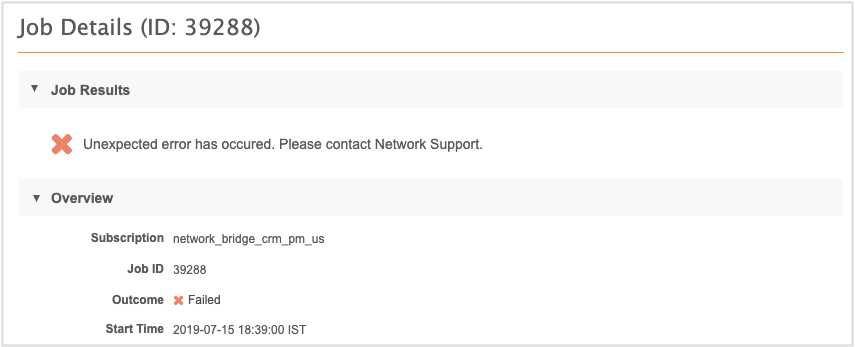 To access the Job Details page, click the job ID in the Job History section at the bottom of the Network Bridge page. The Job History section displays after the first Network Bridge subscription job runs.