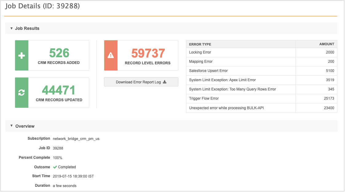 This section highlights the Veeva CRM records that have been added and updated and any errors that occurred during the job. If errors occurred, a count for each record-level category displays in the Error Type table. Click Download Error Report Log review the errors in more detail.