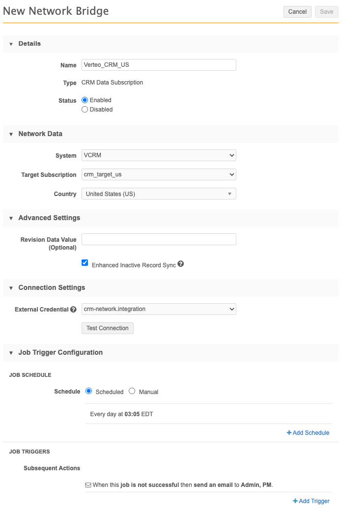 When the Network Bridge job runs, the target subscription files are transformed into the format required for Veeva CRM accounts. Your Veeva CRM org will be updated with the data from Network.