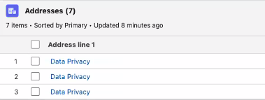 When opted-out and anonymized addresses are pushed to Veeva CRM, the Address Line1 field is populated with a data privacy value, for example, Client Data Privacy or Anonymized Record. This is the same value that is populated in the Name field on the account in CRM.