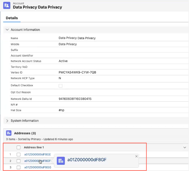 Addresses that were opted-out and anonymized before 23R3.1 are not backfilled with these values in Network or in Veeva CRM. For these reccords, the Address Line 1 field value is masked with the address ID.