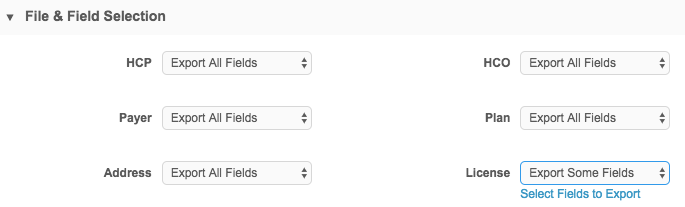 In the File & Field Selection section, if Export Some Fields or Do Not Export is selected for License, click Select Fields to Export. If Export All Fields is selected, no change is required; skip to step 4.