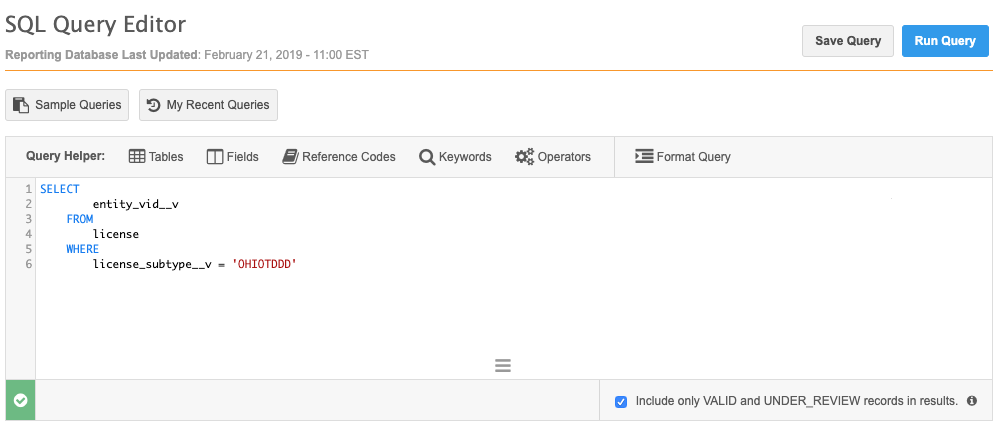 To find the records that have been updated with Ohio TDDD licenses, create an advanced ad hoc query using Network reports (Reports >SQL Query Editor).