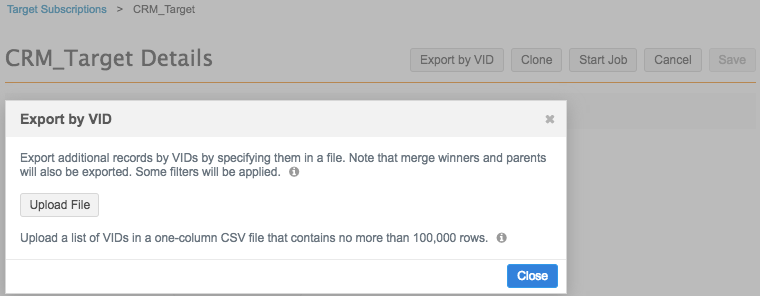 The CRM Bridge Data Subscription job is scheduled in the CRM Process scheduler. If the subscription is scheduled, the VIDs are exported the next time the job runs and the VID file is removed from the subscription.