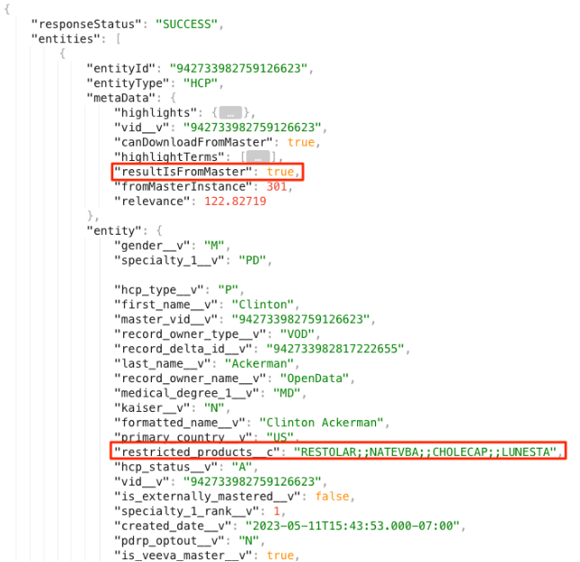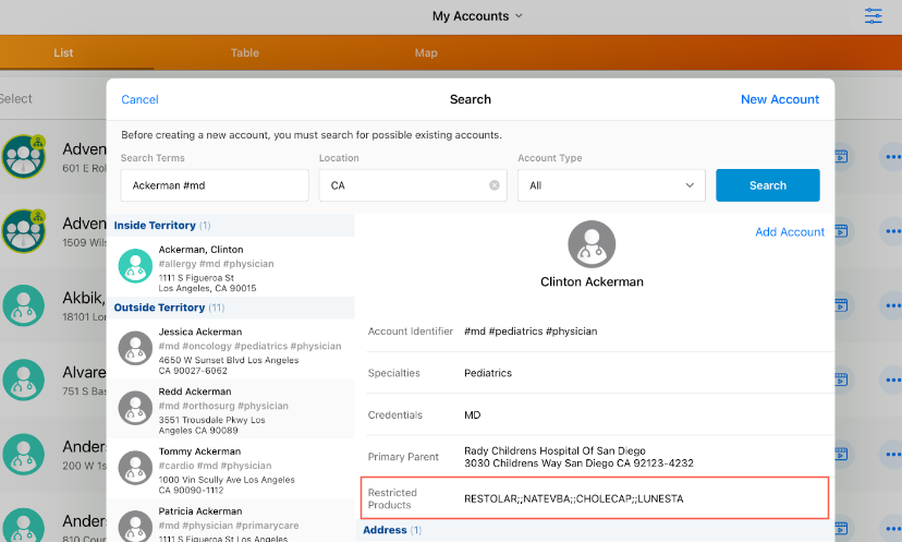 When a sales rep searches for an HCP in Veeva CRM, the Restricted Products custom field displays with the calculated value so the rep can decide if they should download the record from OpenData.