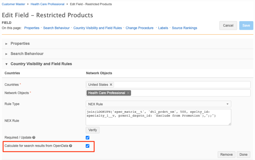 In the Country Visibility and Field Rules section, select the Calculate for search results from OpenData setting.