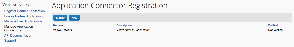 - On the Application Connector Registration page, click Modify to update an existing connector or click New to add a connector.